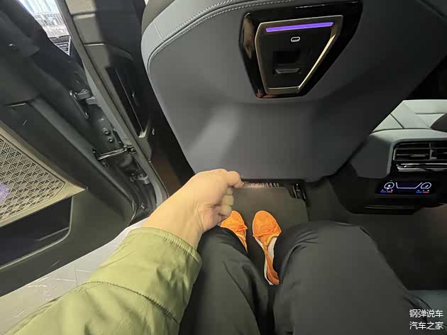 坐进后排,头部空间一拳半,腿部空间三拳有余。这款车乘坐空间宽敞,并排坐三人不挤,仿皮座椅舒适性也挺好。