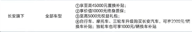 如果你家里有一辆木头独轮车,别藏着掖着,推到长安旗下随便一个4S店,都可以抵扣1000元的置换补贴!这恐怕是普通烂木头最高光的时刻!同时,你家里有用不上的自行车、摩托车和三轮车,也能享受2000元的置换补贴,如果是汽车的话,至高享受45000元置换补贴。