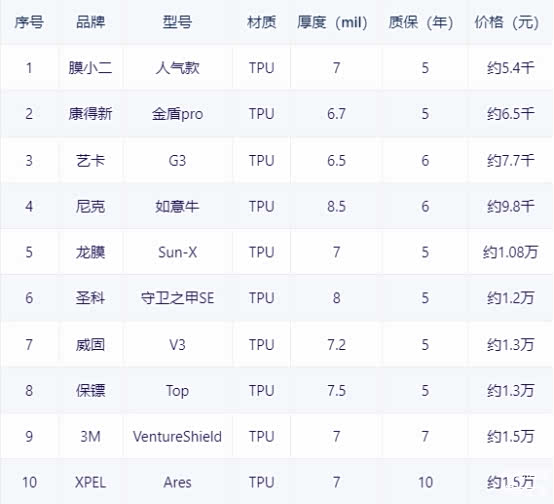 选取的这十个隐形车衣型号是各个品牌的入门基础款车衣,价位也是各个品牌的最低价。