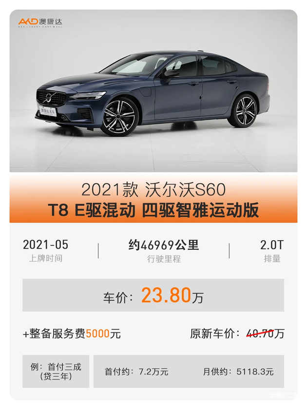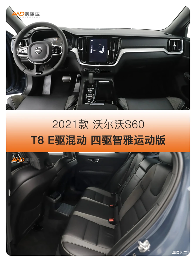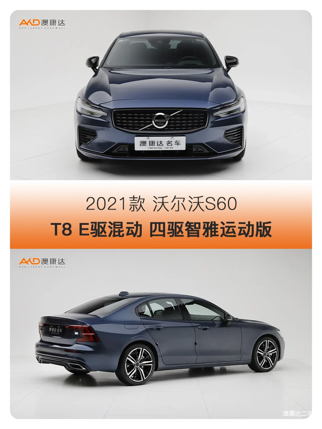 澳康达在售这台2021款 沃尔沃S60 T8 E驱混动 四驱智雅运动版,属于高配,其搭载了2.0T四缸发动机配后置电机组合的混动系统,综合最大功率391马力、最大扭矩640牛·米,0-100km/h的加速时间为4.7秒,这跟性能车几乎没啥差别了,除了动力强劲,它开起来也有运动车的味道,特别是底盘,喜欢开车的你会喜欢的,而这台蓝色车漆搭配部分黑化组件的视觉效果也很出色,目前仅售23.8万,首付7.2万即可!