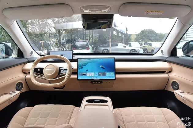 内饰的设计,星纪元ET走的也是简洁科技的路线。在内饰用料上,大量实木饰板和软包材质的使用,甚至会让你怀疑这不是一台起售价还不到20万的车。全系车型均配备了15.6英寸的悬浮式中控大屏和10.25英寸的全液晶仪表盘,中控大屏支持2.5K高清分辨率显示。