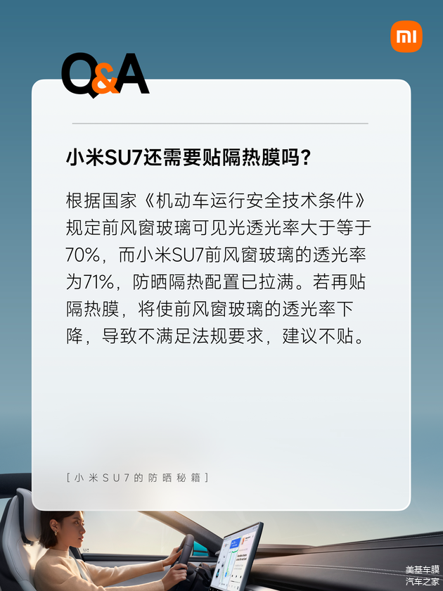 首先小米强调了车玻璃防晒的重要性,车玻璃防晒能够保护驾驶(乘车)人的皮肤健康,以及保护车内设施和电子设备,可以说,这是玻璃隔热膜的主要作用。