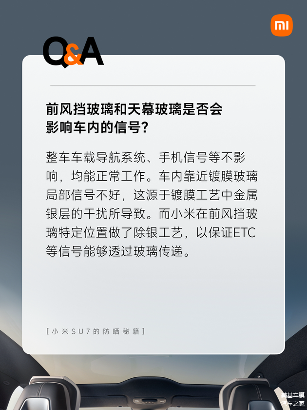 还有,网友们在意的,如此高隔热高防晒的玻璃工艺,对于车内信号会不会有影响问题,电车来说电子元器件较多,影响到车内信号是会对驾驶体验大大“打折扣”。小米声称整车车载导航系统、手机信号等不影响,均能正常工作。车内靠近镀膜玻璃局部信号不好,这源于镀膜工艺中金属银层的干扰所导致。而小米在前风挡玻璃特定位置做了除银工艺,以保证ETC等信号能够透过玻璃传递。