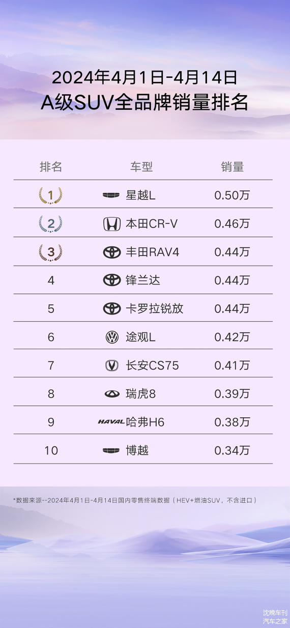从4月1日至4月14日销量数据来看,A级SUV市场排名前五的车型中,仅有星越L一款自主品牌车型。作为一款极具竞争力和代表性的车型,星越L凭一己之力引领自主夺得A级SUV销冠,彰显了中国自主品牌的信心与实力。