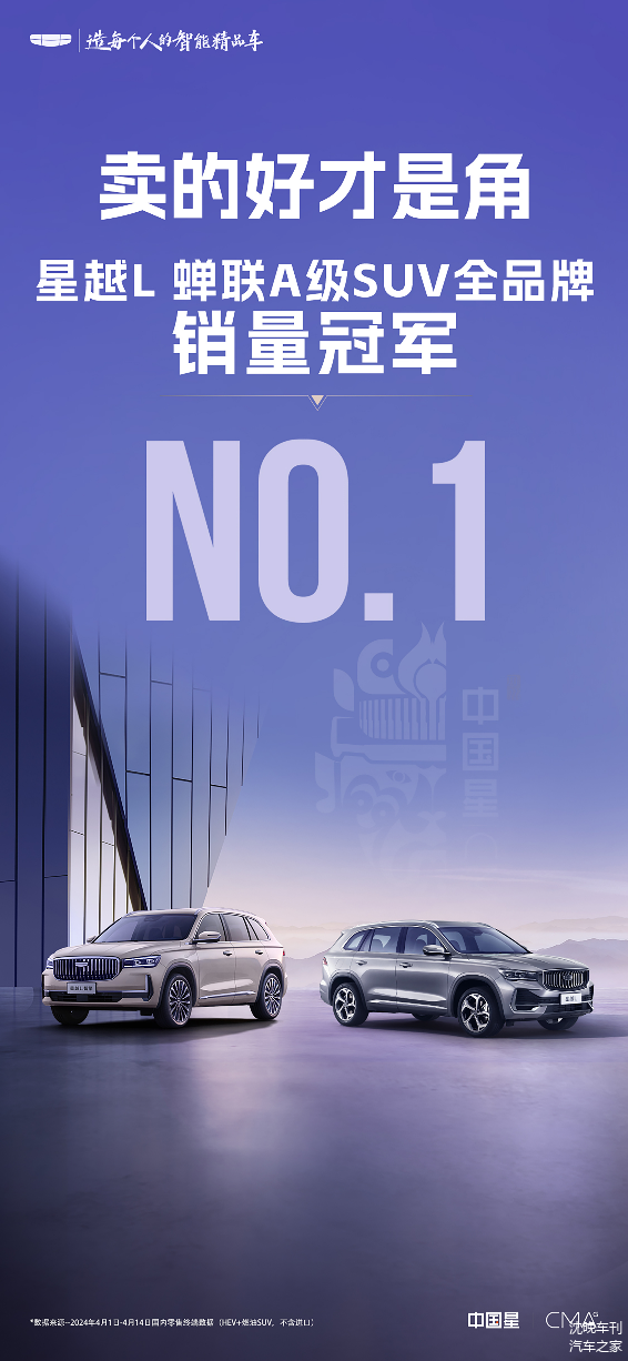 吉利中国星• 星越L 4月销量再创佳绩!继4月第一周跑赢合资勇夺周销冠之后,星越L第二周蝉联A级SUV全品牌销量第一,以破局者和掌局者的姿态,重塑A级SUV市场格局,为中国制造上大分。