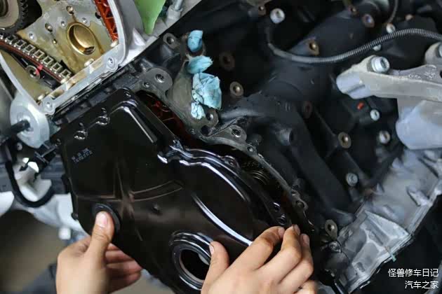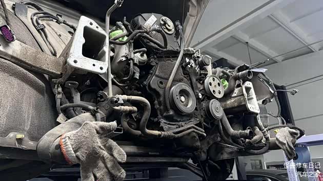 是场硬仗,满是油泥,发现之前有换过正时系统的痕迹,现在正时前盖、曲前油封又漏了。