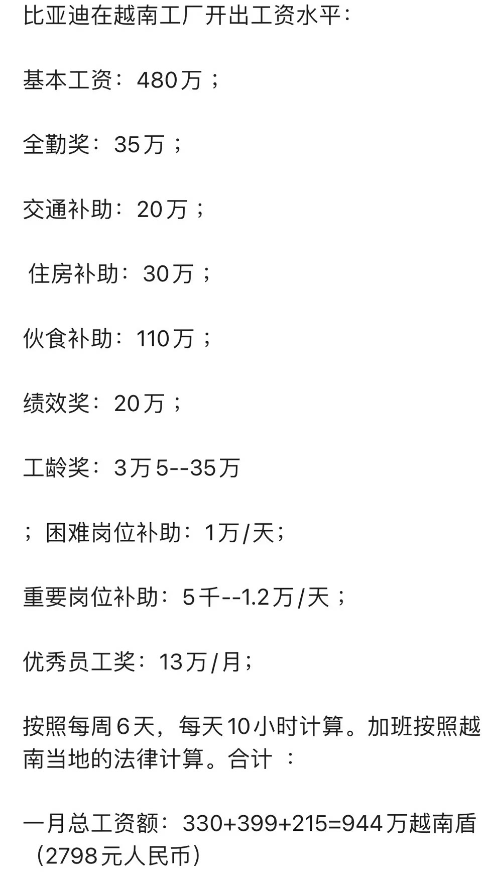 比亚迪越南工厂待遇被曝光,每天工作10小时,一个星期上班六天,工资480万,还有交通补助20万,全勤奖也有35万,餐补110万,总换算过来大约2800人民币。 其实这个工资还是很高的,因为越南2023年人均工资只有2000出头,现实中能达到平均水平的人会更少,另外越南社会生活水平也没有那么高,物价会低一些,因此对越南人来说,比亚迪工厂是高待遇外企。