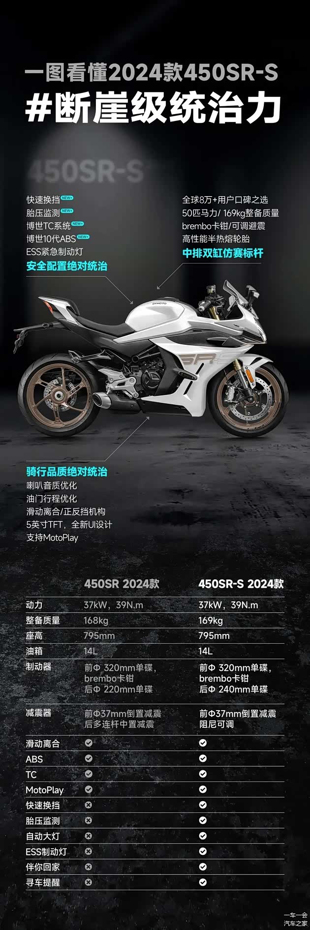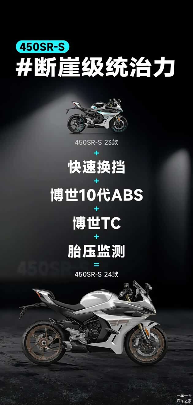 TC系统同样来自博世,配合新增的快速换挡,成本上肯定有所增加,但售价反而进行了下调,说明春风还是有诚意的,想把这款新车卖好。不过需要注意的是,2024款450SR-S搭配的是单向快排。此外还增加了胎压监测、自动大灯、ESS制动灯、寻车提醒等功能,优化了喇叭和油门的行程,设计了新的TFT仪表UI界面。