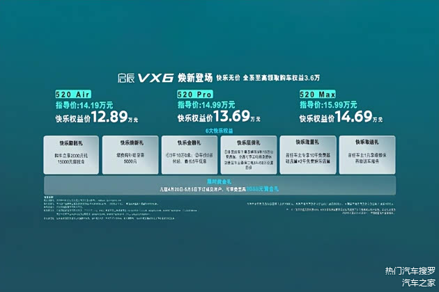 顶配版本520 Max版,指导价为15.99万元,快乐权益价为14.69万元。启辰VX6 520 Pro版指导价为14.99万元,快乐权益价13.69万元。启辰VX6 520 Air 版指导价为14.19万元,快乐权益价12.89万元。启辰VX6给客户带来了6重大礼包,全系至高领取购车权益3.6万。