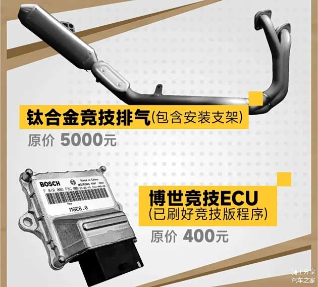 至于老用户的有偿升级服务则是针对ECU和排气管,现在花2500元就可以享受价值5500元的钛合金竞技排气管和博世竞技ECU,如此一来你车辆的性能将会有明显提升。