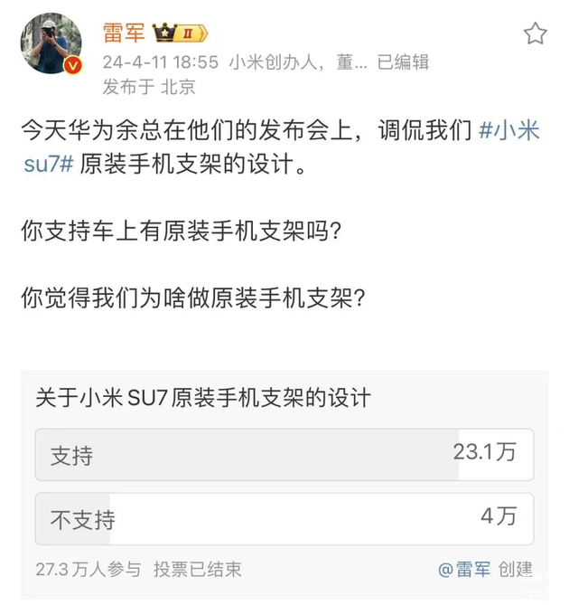 而就在不久前小米SU7上市发布会上,雷军刚刚重点介绍了新车配备手机支架。在余承东言论发表后不久,雷军发布微博询问“你支持车上有原装手机支架吗”,获得了超过20万人支持。