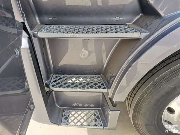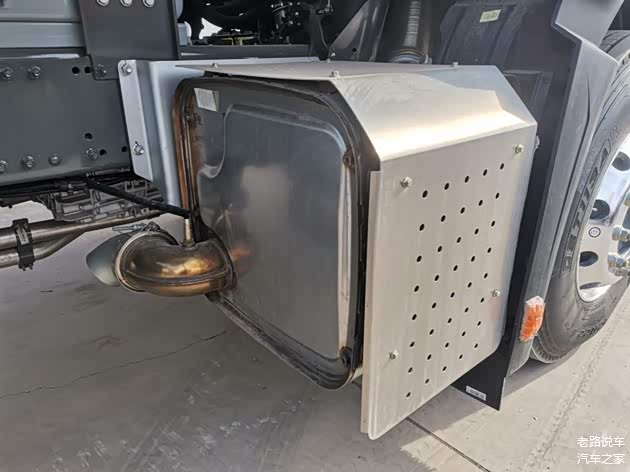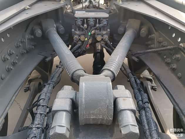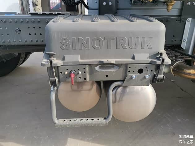 先进可靠的车架是豪沃TH7的卖点之一,采用曼技术车架,结构合理,承载力好,也是很多用户选购它的一大理由。车架左侧空间比较大,车架右侧布置的是排气管、蓄电池舱、储气筒。驾驶室后方布置的是1500L LNG气瓶,这是它长续航的重要保证。全车采用少片簧悬挂,前桥减震钢板2片,中后桥减震钢板3片。