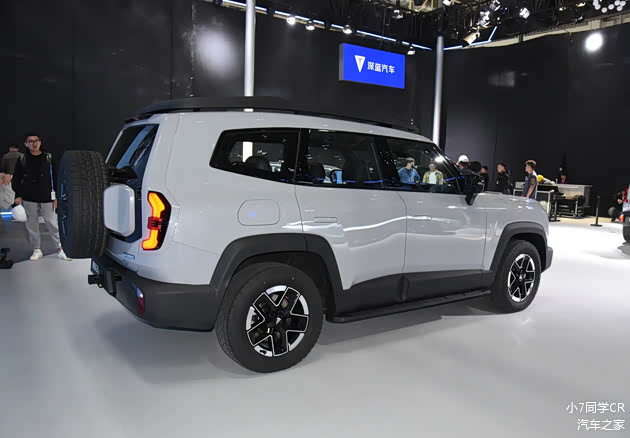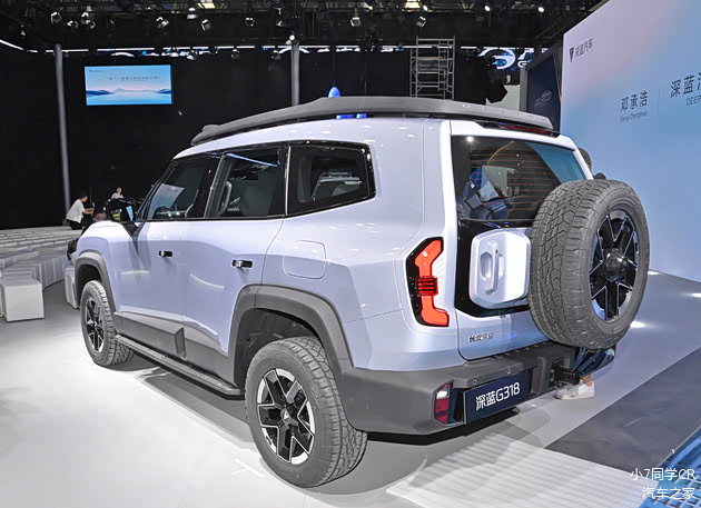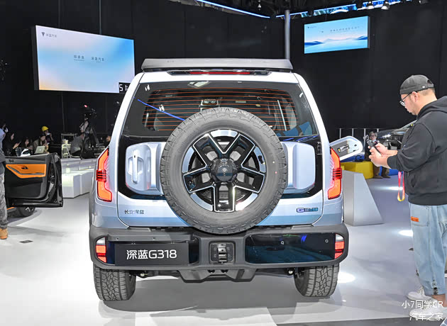 车尾部分,深蓝G318的车尾使用了侧开门设计、外挂式备胎(就提替换储物箱)、左右独立C型后尾灯,并且后尾门上还点缀有熏黑元素。同时,后包围同样配备了造型硬朗的熏黑套件(中间配拖挂头、具备1.6吨拖挂能力)。