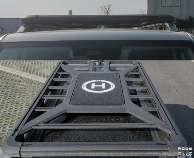 需要特别说明的就是车顶附加的行李台了,中间带有无人机起降平台,这部分在目录申报图里是出现过的,能够看到外框和改装展示车完全一致,中间有个圆圈,内嵌字母H,懂行的立即能够看出这是无人机起降之用的,即使改装版大家没想法,但这个无人机起降专用的行李台倒是可以无损加装。