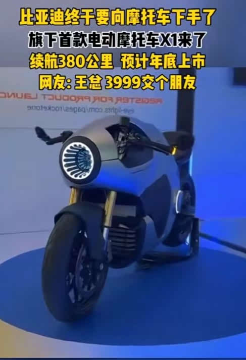 比亚迪这是要介入摩托车行业了吗?要是这样的摩托车只卖3999元,那可真是将火到极点。 现在比亚迪的电动摩托车已经获得了国家认监委的批准,比如这张在2023年2月8日发的证书,这是一个能源管理体系的认证证书,有了它,就意味着制造过程就没有什么阻力。 这个图片就是比亚迪的首款电动摩托车X1,续航里程会达到380km,估计今年年底就可以和中国消费者见面了。