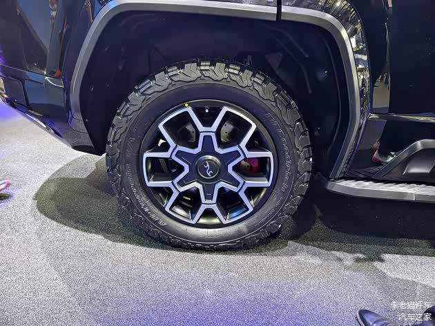 侧面轮眉更加挺翘,耐刮性有所提升。左A柱位置配备了涉水喉,新车最大涉水深度达到1400mm。侧面配备了126mm宽的固定脚踏板。轮胎采用20英寸AT胎,轮毂为越野锻造轮毂,标配黑色刹车卡钳,可选铜色或者红色卡钳。