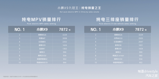 作为首款打破MPV界限的大七座车型,小鹏X9凭借着从产品设计到智驾科技的全面创新,实力获封“九冠王”称号。它不仅打破了传统MPV千篇一律的方盒子造型,将大七座MPV、大四座SUV合二为一,开创出超智能大七座家庭用车新品类,成为名副其实的品类创新之王。同时,小鹏X9还是市场公认的销量之王,2024年1月-3月累计交付7872台,稳居纯电MPV销量冠军以及纯电三排座销量冠军的宝座。