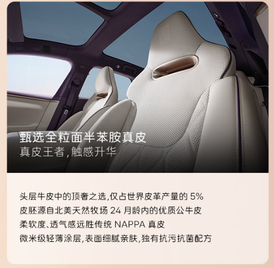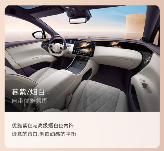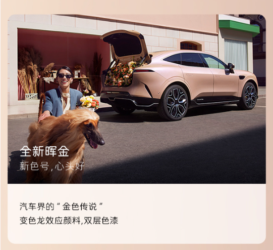 1.新增的配色“晖金色”,灵感来源于岳阳楼记中的“浮光跃金,静影沉璧";搭配上这次新增的"暮紫/烟白"主题内饰颜色,豪华中带着中国味道的淡雅感。