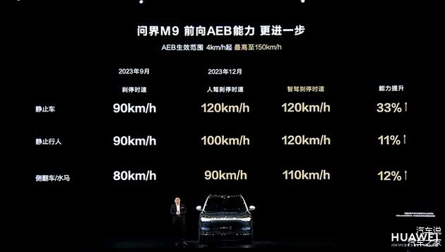 根据新车发布会上的信息显示,2023年9月上市的问界新M7,其AEB系统的最高刹停时速为90km/h;12月上市的问界M9, 其AEB能力更进一步,最高支持120km/h时速主动刹停。不过这些数据的前提是,需要华为高阶智驾系统的支持。