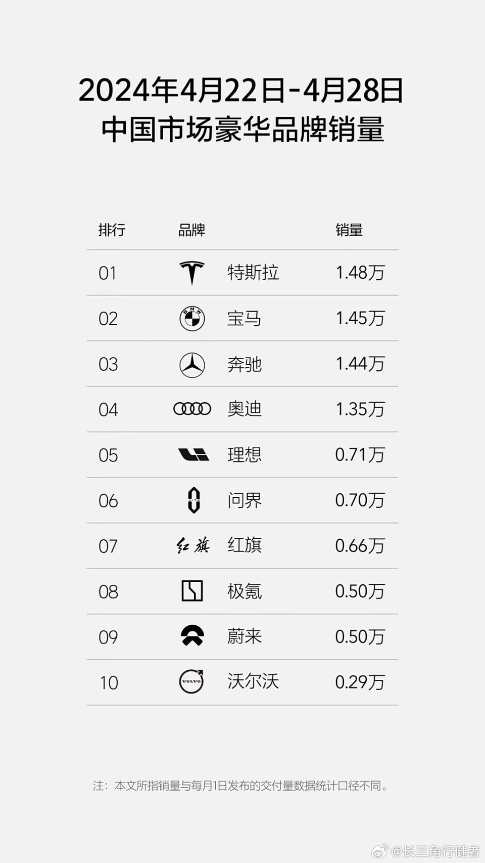 另一张榜单上,单周豪华品牌销量中,BBA和特斯拉打的有来有回。红旗单周0.66万、沃尔沃单周0.29万辆,进入了第十名。