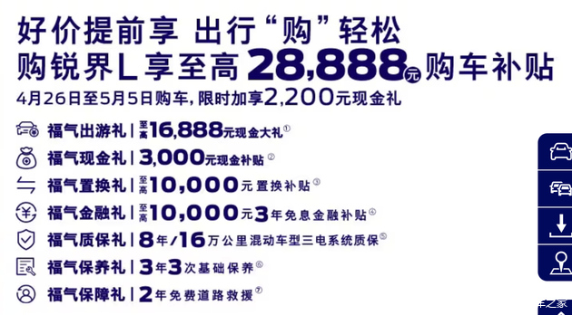 四月底有一款新车正式迎来上市,这款车型就是 福特锐界L四驱7座版本,厂家指导价24.98万。值得一提的是,该新车在终端还有着约2.9万元的购车补贴,裸车价基本就在22万元左右。
