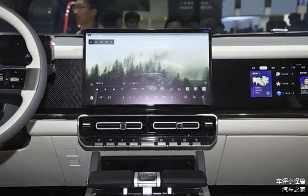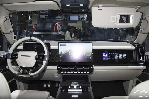 内饰上,兼具硬派与科技感,五块大屏的设计,12.3英寸的仪表屏、15.6英寸的中控屏、12.3英寸的副驾娱乐屏、8英寸的后排液晶屏,以及一个HUD抬头数字显示。同时空调出风口处采用了类似铠甲的纹路设计,很硬派。