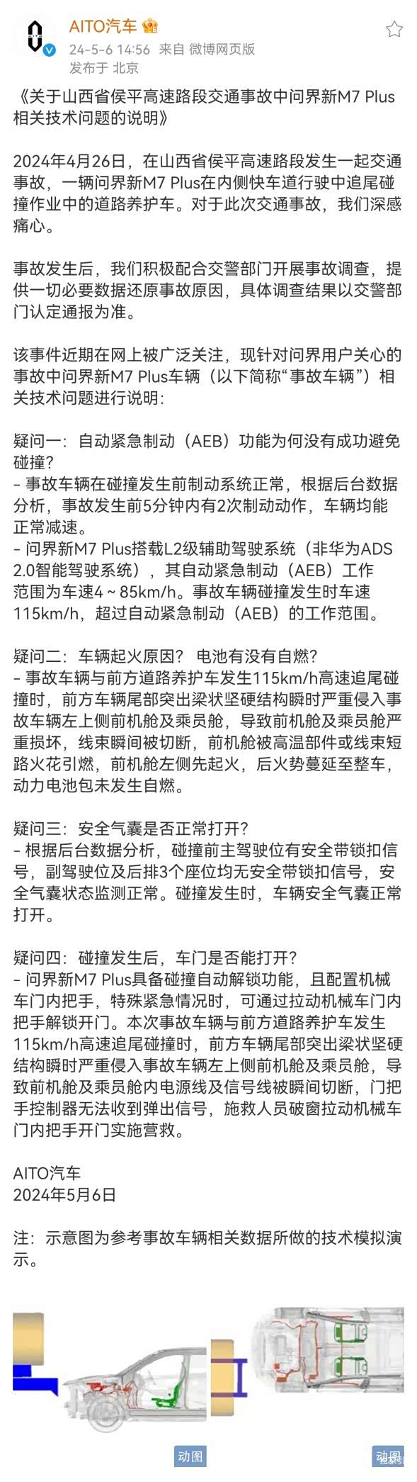 最近,问界新M7 Plus山西运城的交通事故在网上传得沸沸扬扬。就在日前,AITO汽车官方发布了事故车辆相关技术问题的说明。