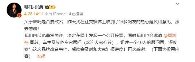 哪吒CEO 张勇发起了一项投票调研,就“哪吒是否要改名”一事向所有用户公开征求意见。投票结果显示,此次投票过程中至少有 1.3 万人参与,最终约有 29% 的人支持继续叫哪吒,有 32% 的人支持哪吒改名为合众,有 24% 的人支持合众和哪吒分产品线并行,还有 15% 的人建议改其他名字。