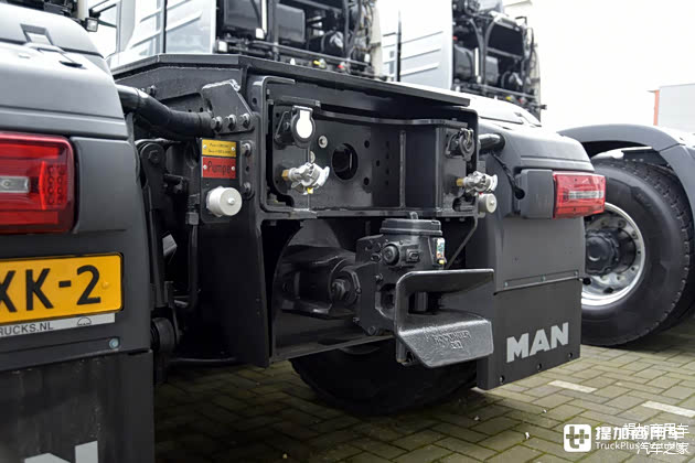 除单车运输之外,车辆也支持多车串联运输。在这一需求下,这三台曼恩TGX大件车在保险杠外侧增添了粗壮的牵引钩。它们与车架直连,与加强柔性车架匹配,保障可靠性、坚固性。