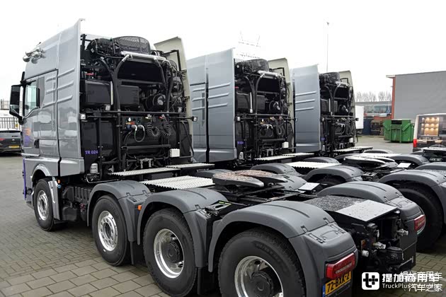 在欧洲法规之下,这三台曼恩TGX的GCW仅为250吨。不过,它们都通过了曼恩的认证,GCW可扩展至335000千克,也就是335吨。在三车串联工作的情况下,它们能够撼动千吨级别的超级大件货物,性能可谓超级强悍。