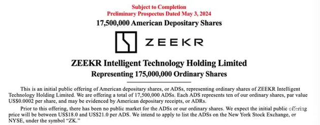 美国东部时间5月3日,极氪向美国证券交易委员会(SEC)提交更新的准招股说明(红鲱鱼招股书),并计划于5月10日以“ZK”为股票代码在纽交所上市。