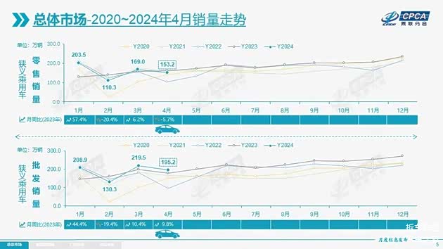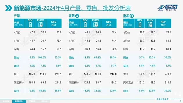 据乘联会刚刚发布的消息,2024年4月全国乘用车市场零售153.2万辆,同比下降5.7%,环比下降9.4%。今年以来累计零售636.4万辆,同比增长8.0%。4月新能源车市场零售67.4万辆,同比增长28.3%,环比下降5.7%。厂商排名方面比亚迪依旧遥遥领先。