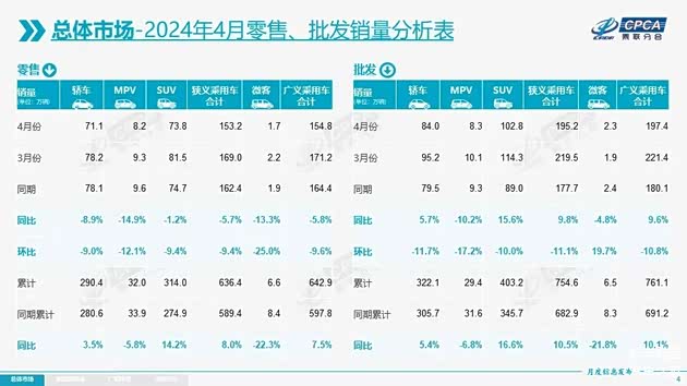 从上图可以看出4月份整体表现较差,同比下滑5.7%,其中MPV下滑最大达14.9%,其次是轿车下滑8.9%,下滑最小的是SUV 1.2%,不过累计销量是增加的。