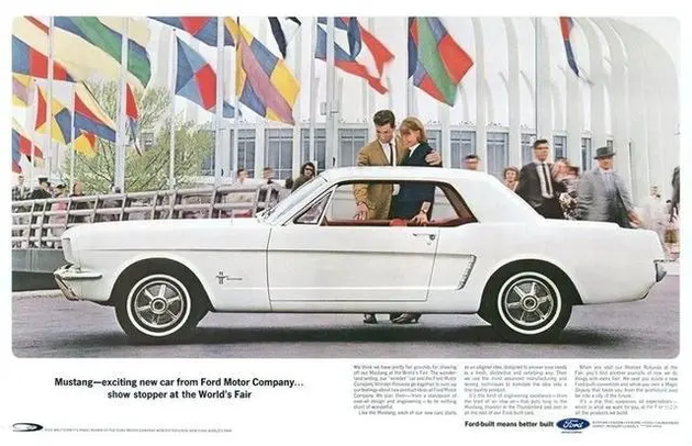 第一代的Mustang在1964年的纽约世博会上首次亮相,与大多数人口中的“肌肉车”不同,Mustang的诞生实际上开创了一个名为“Pony Car”的新的细分领域市场,其目标是以较低的价格,为广大年轻提供一台性能不俗的跑车。