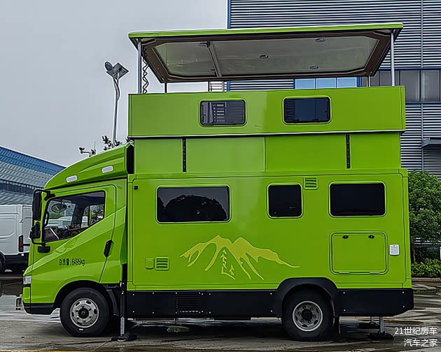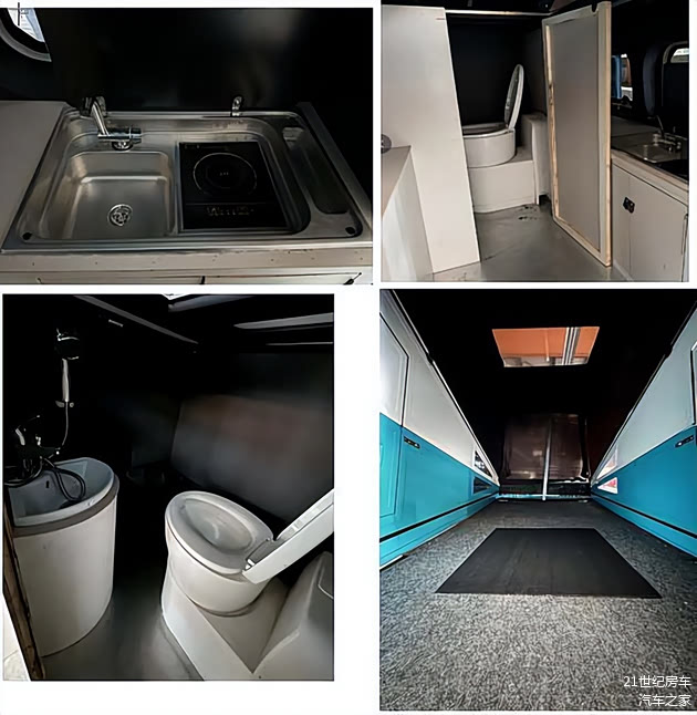 升顶背驼部分比较简单,顶部为升顶休息区,下方生活区提供厨房区、独立卫浴间,新车更适合2人左右少人数旅居体验。