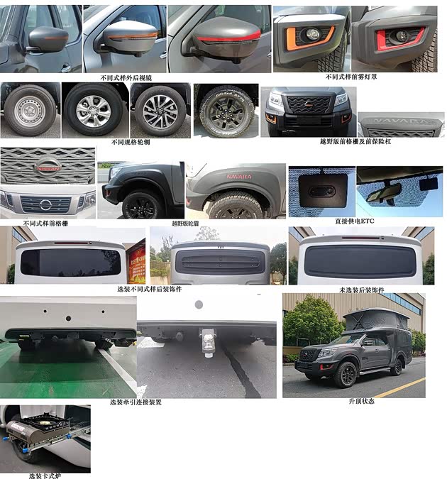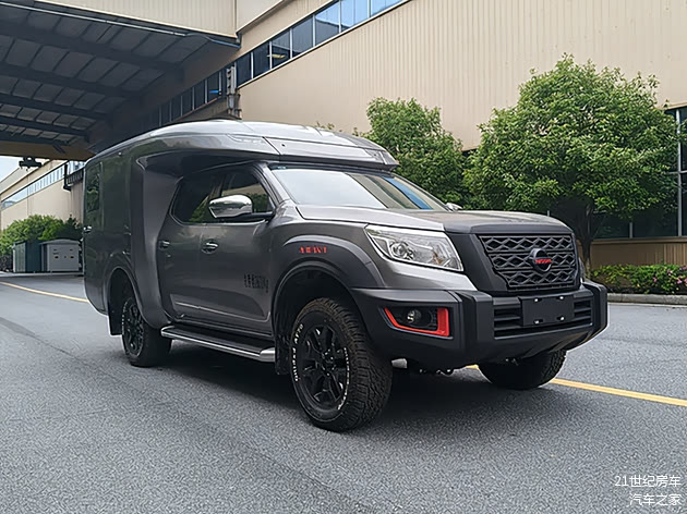 霞客乐基于 日产纳瓦拉底盘打造出了一款升顶皮卡房车,无论颜值还是实用性都是新车看点。在外观上,整台车强调越野风格,车头位置进行了黑化处理,轮圈及轮胎替换成了越野风格。额头造型非常注重空气动力学,这在房车设计上并不多见。