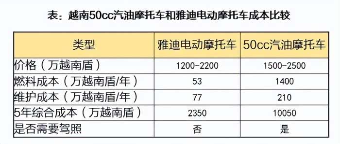 未来还会进一步增加,因为电动车的使用成本比摩托低多了(图3),购买成本雅迪略低,5年使用下来,燃油摩托车的综合成本接近于电动摩托车的5倍,算下来,使用电动摩托车一年能够节省1540万越南盾,这差不多是越南人两个月的工资。