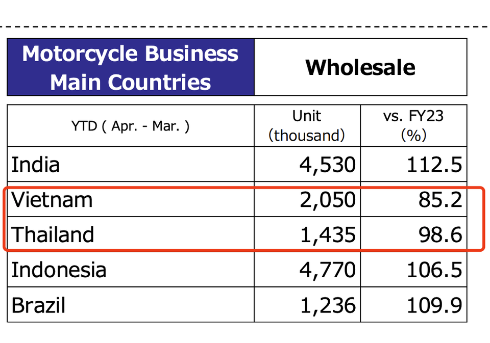 当然也是受越南经济放缓影响,2023全年越南摩托销量为279万辆,同比下滑17.9%,本田下滑19.8%,超过整体的跌幅