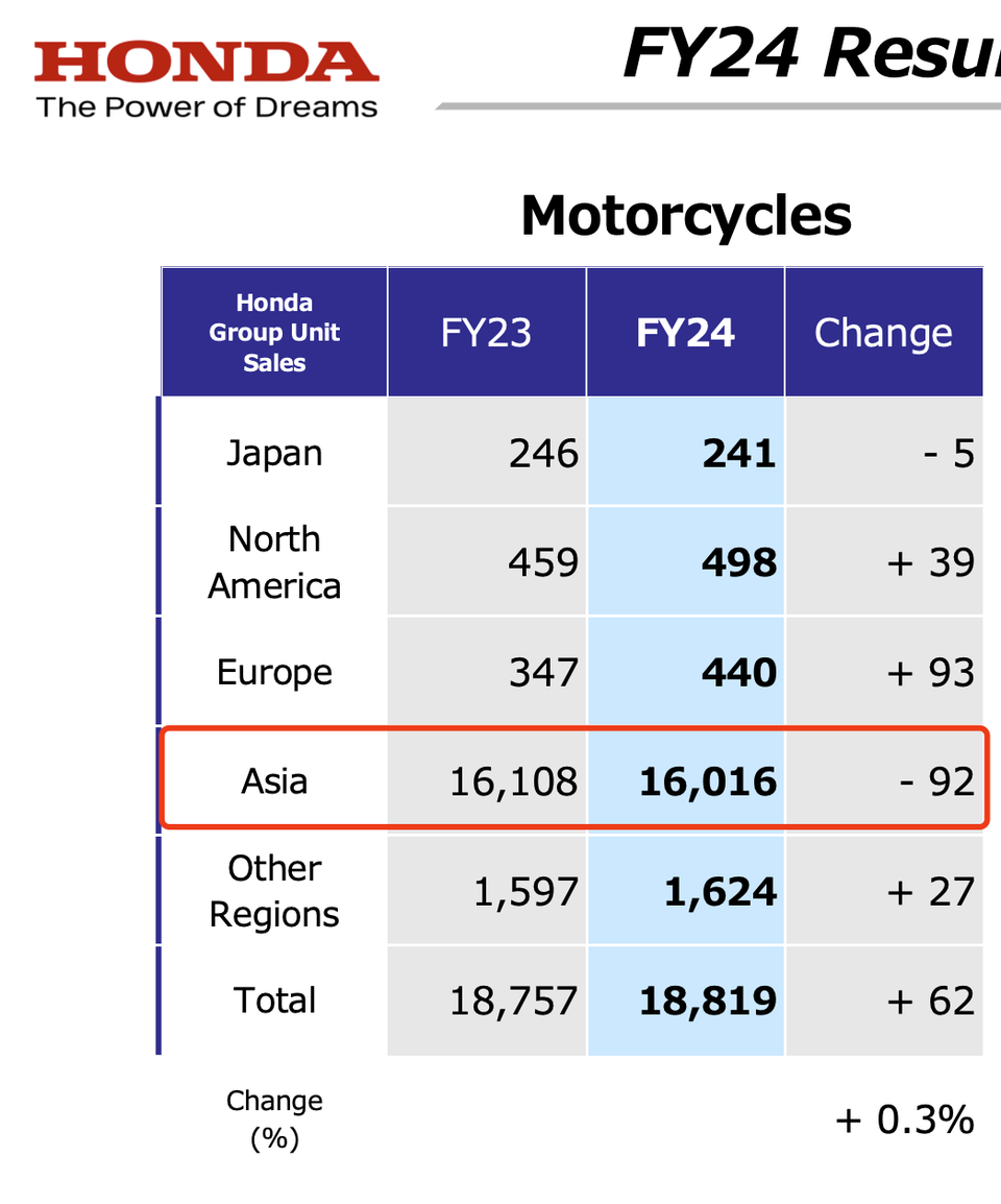 2023财年(2023.4-2024.3)本田卖了1881.9万辆摩托,微增0.3%,其中有1601.6万台卖到了亚洲,占比超85%