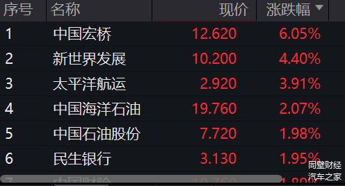 港股通红利30ETF(513820)标的指数——港股通高股息(930914)成分股中,受益于地产链修复,资源股中国宏桥大涨6%,新世界发展涨4.4%,中国银行、中国财险、中国建材、工商银行、建设银行、太平洋航运、中国海洋石油等均飘红。