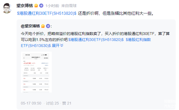 据了解,知名大V望京博格5月17日表示,把略微溢价的港股红利指数卖了,买入折价的港股通红利30ETF(513820),薅到折价“羊毛”;今日再次发文,认为港股通红利30ETF(513820)依旧折价,而涨幅反而高于其他红利。