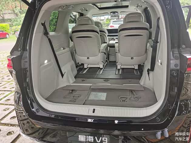 星海V9车身尺寸长宽高分别为5251*1920*1820mm,轴距为3018mm,实际体验中,笔者1.71米的个子,在第一排调节到舒适的驾驶位置时,第二排调节到腿部空间有两拳半的距离时,在第三排座椅上,笔者依旧有两拳多的腿部空间,而头部有一拳多的空间,并且第三排座椅靠背是可以调整角度的。至于车内的储物空间也很丰富,完全不用担心。在满载的情况下,尾箱内还可以放下6个20英寸的行李箱。