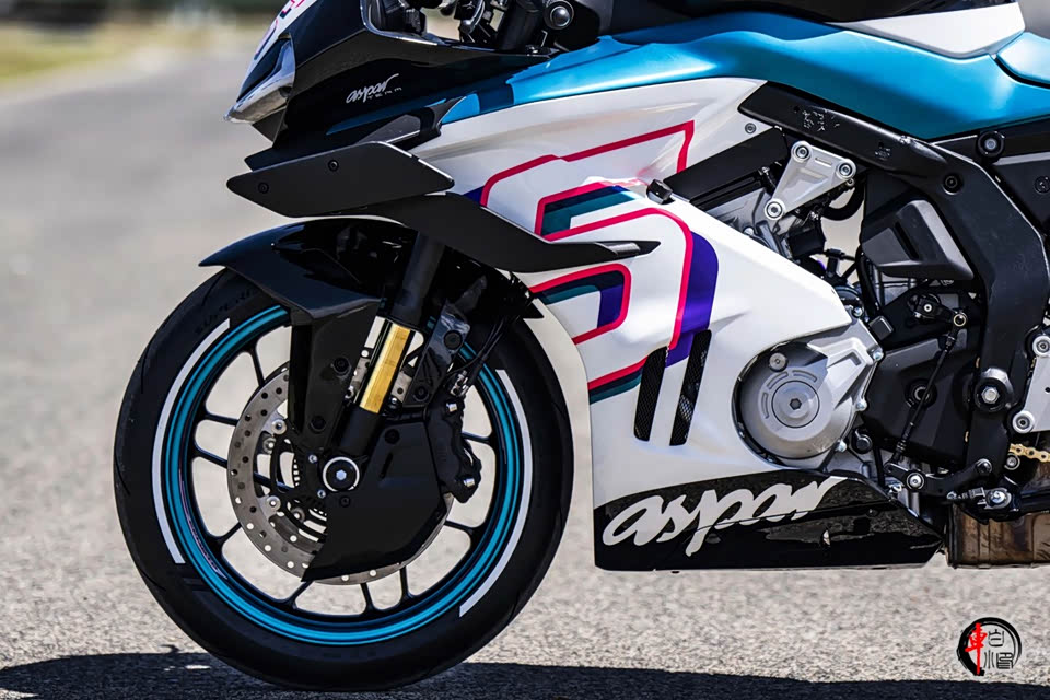 在底盘硬件方面,车身框架采用钢制结构,搭配钢制副车架,偏向于城市道路骑行的运动仿赛。后摇臂采用欧翼式对称设计,减震系统可能是欧林斯减震,并支持完全可调。刹车系统配备了前后盘刹和西互卡钳,确保出色的制动性能。