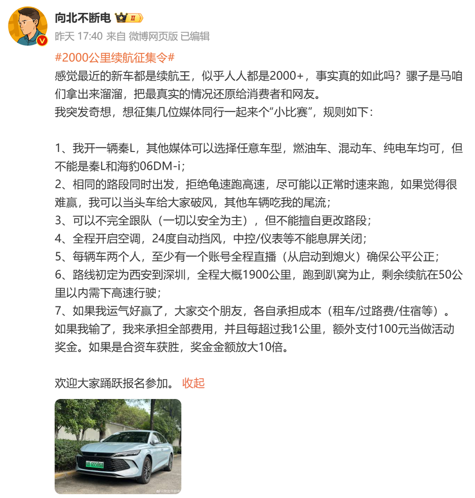 秦L上市在即,比亚迪御用“车评人”向北不断电,发出2000公里续航测试征集令。