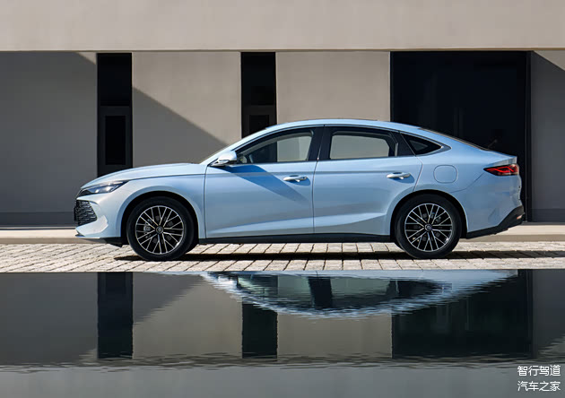 车身侧面,秦L的线条感较强,溜背式设计使得车身侧面整体呈“低趴”姿态,展现出龙腾态势。采用了双腰线设计,上方的腰线从前大灯处一直延伸至后门使得整体车身更加修长,下方内凹式的筋线整体营造出更为立体的视觉效果,凸显新车的力量感。