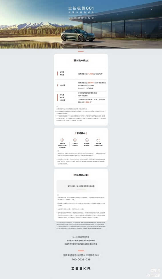 先来看极氪001 的5月限时购车权益,所有下定极氪001车型的用户,均可享受价值1000元的7kW智能家充桩套餐(30米)和ZAD完全智能驾驶辅助系统终身功能体验,不过6月份这两项权益是否还免费送,目前依旧是个未知数,以智能家充套装为例,虽然它的价值不算非常高,但把这节省下来的1000元分摊到日常充电的费用,这也算是一件美事儿。