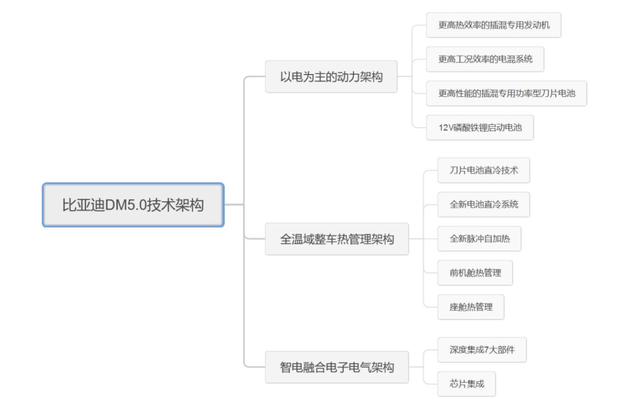 依据比亚迪官方公布的资料,DM5.0主要有三大技术架构,分别是以电为主的动力架构、全温域整车热管理架构、智电融合电子电气架构,三大架构相互配合,同时核心硬件与软件都实现了全面升级,最终才实现了三个全面领先。