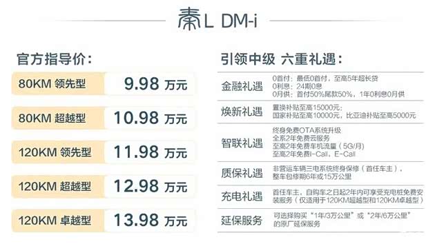 2024款比亚迪秦L提供5款配置车型,分别为:80KM领先型、80KM超越型、120KM领先型、120KM超越型、120KM卓越型,售价9.98-13.98万元。
