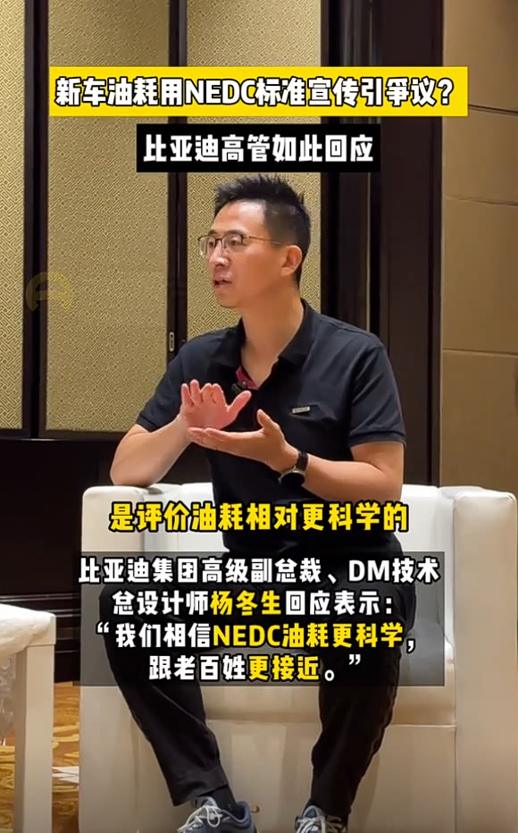 针对网络争议,比亚迪集团高级副总裁DM技术总设计是杨冬生在接受采访时进行了回应,其表示:“NEDC时评价油耗相对更科学的,和百姓更接近的一个工况。”