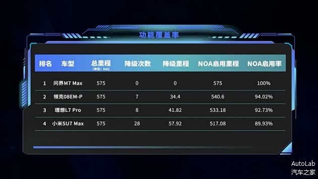 首先是启用里程占比。领航辅助驾驶,我们当然希望体验越连贯越好,但现实是,由于定位信号和地图的原因,很多车型都会出现「降级」的情况,即系统从NOA状态降级为LCC状态。